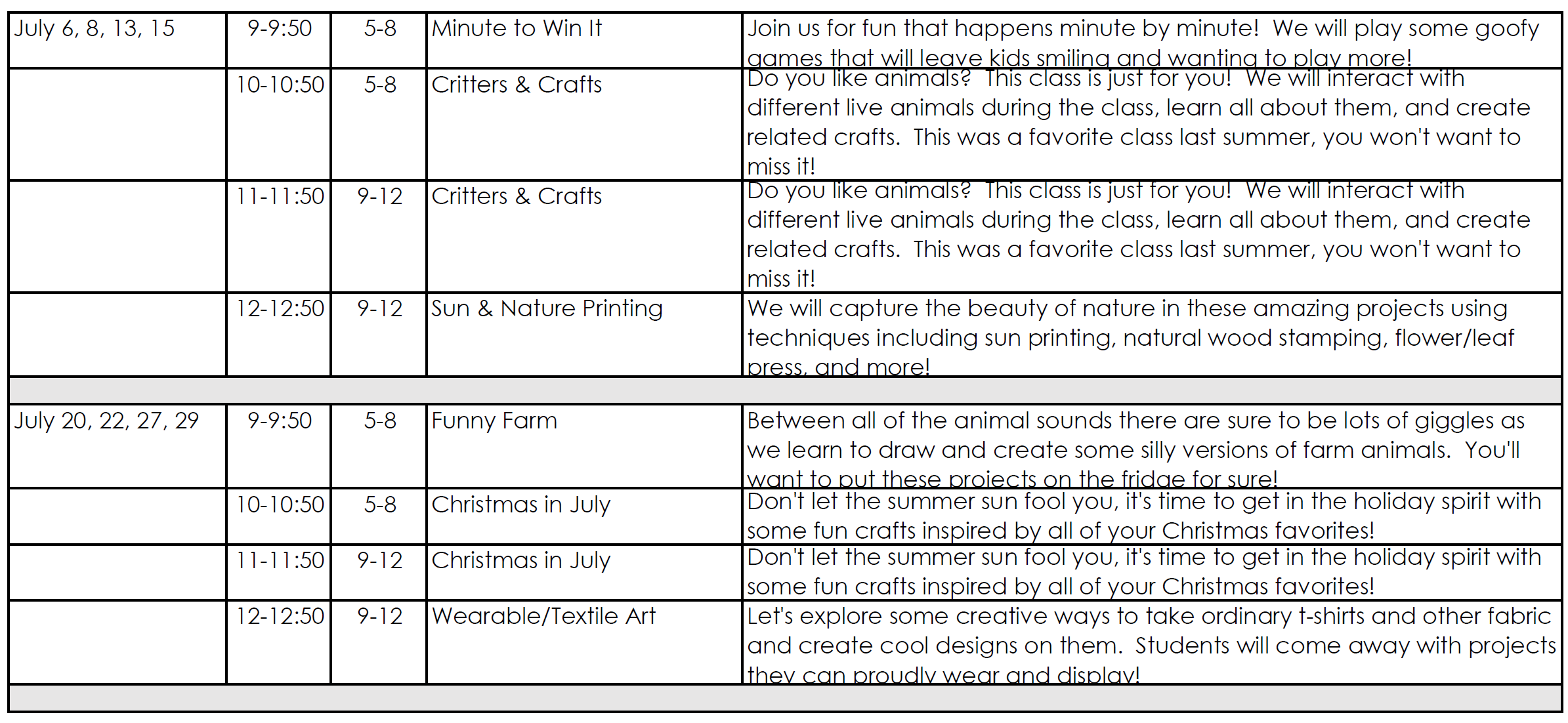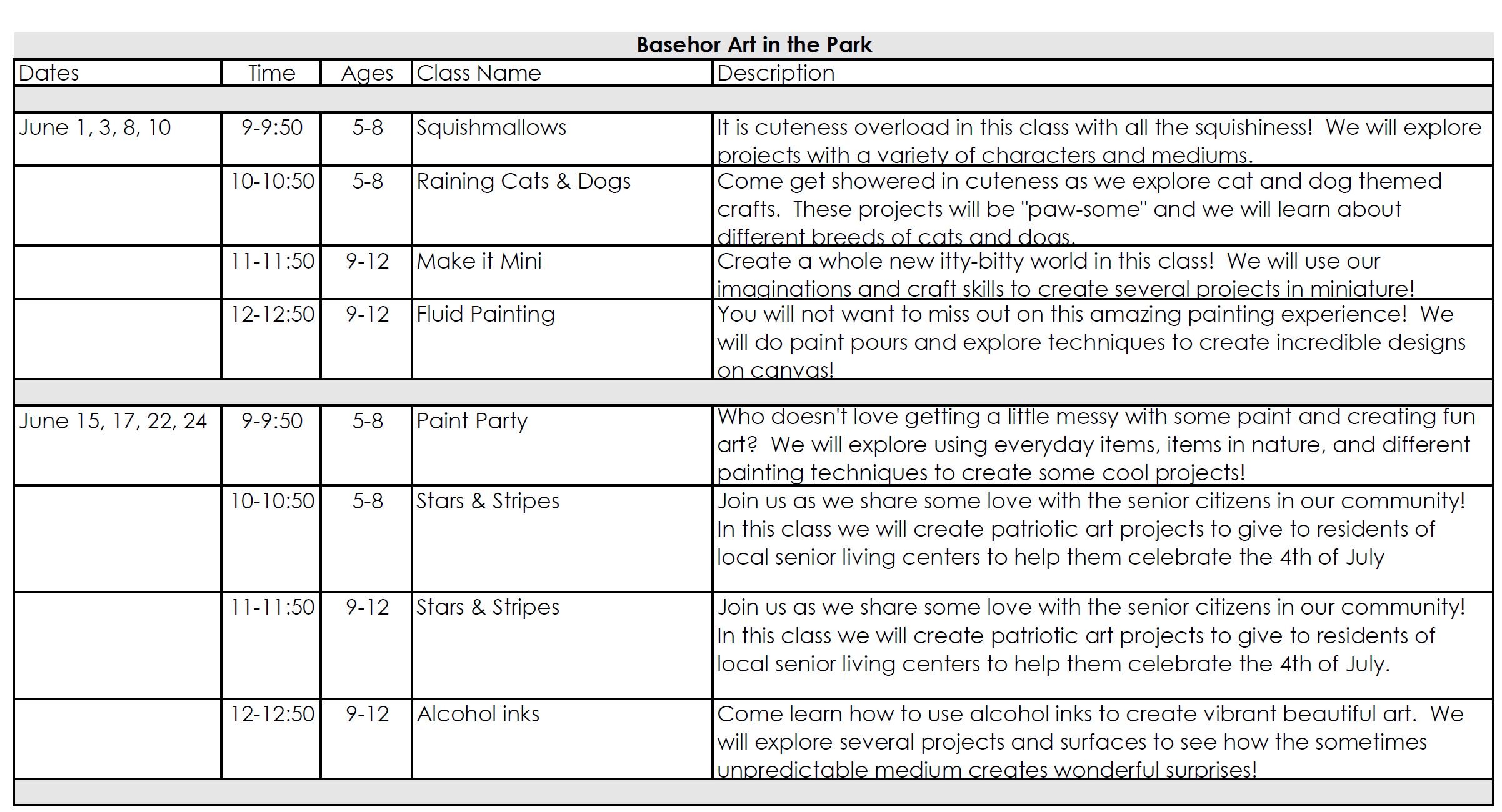 Join us this summer for Art in the Park. Art in the Park will consist of classes for 5-8 year-olds & 9-12 year-olds.