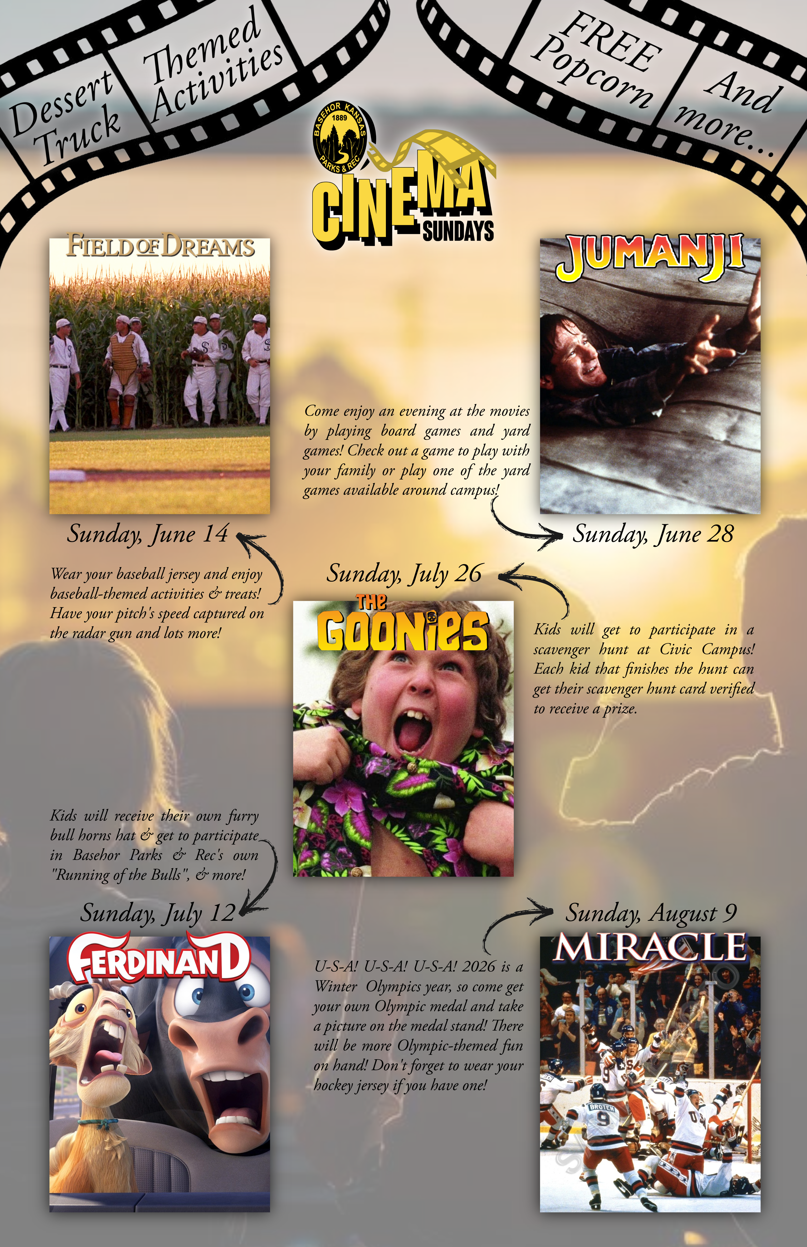 Basehor Parks and Recreation's 2026 Cinema Sundays schedule is here! Each night will include a dessert truck, as well as other goodies like free popcorn/snack. Look for the exciting movie themed mini-events before each showing! We have a lot of fun events planned leading up to showtime!
